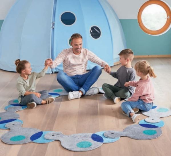 Les sièges circulaires modernes combinent des éléments pratiques et ludiques. L'ensemble se compose de quatre mini-tapis aux formes inhabituelles. Ils sont dotés de boutons-pression et sont donc très faciles à relier. Selon le nombre d'enfants, ils peuvent être agrandis avec des éléments supplémentaires pour former un grand tapis d'assise. En un rien de temps, il y a suffisamment de places assises disponibles pour le matin ou le cercle d'assise. Si le tapis gêne d'autres activités, les éléments de tapis peuvent être rangés tout aussi rapidement. Ils peuvent être empilés pour gagner de la place et sont toujours à portée de main. Et ils peuvent également être utilisés individuellement comme coussin de siège. en matière synthétique polyacrylique résistante.