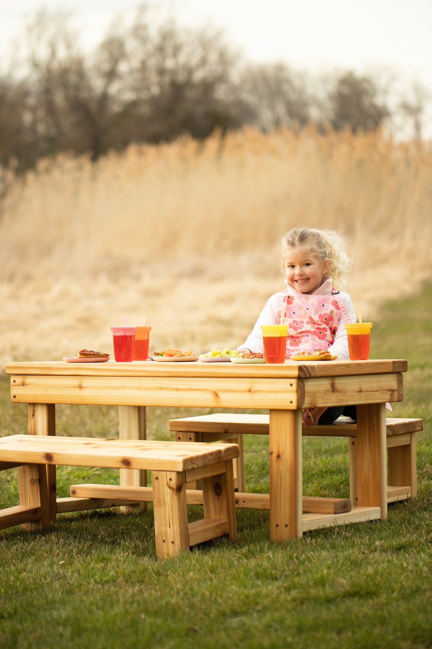 This table is wonderful for use inside or outside your home, or for preschools, schools and daycares. Each table has been carefully hand-sanded smooth for safety and comes finished with Osmo UV ray protectant (a safe and non-toxic finish). It is made of domestically sourced cedar that is known to last for years when left outdoors. We recommend refinishing your table every 2 years or so.