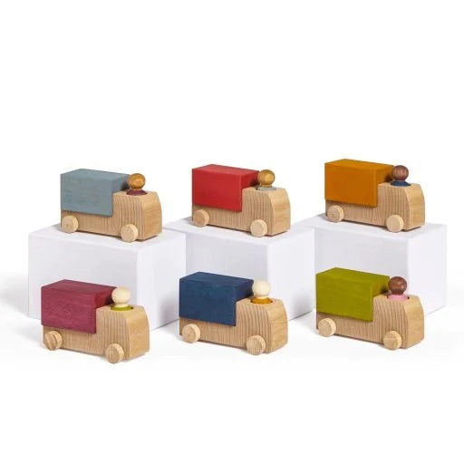 Avez-vous déjà rêvé de devenir chauffeur de camion ? Maintenant vous pouvez! Nos petits camions en bois vous attendent pour prendre la route avec vous ! Lequel choisirez-vous ? Lubulona camions en bois sont disponibles en six couleurs différentes (prune, ocre, citron vert, bleu foncé, rouge et gris) et sont tous accompagnés d'un petit chauffeur de camion. Les camions en bois sont notre dernier ajout au monde Lubulona et sont compatibles avec tous nos produits Lubu Town. Les camions bleu foncé et citron vert se retrouvent également dans nos nouveaux packs de véhicules « sur la route ».