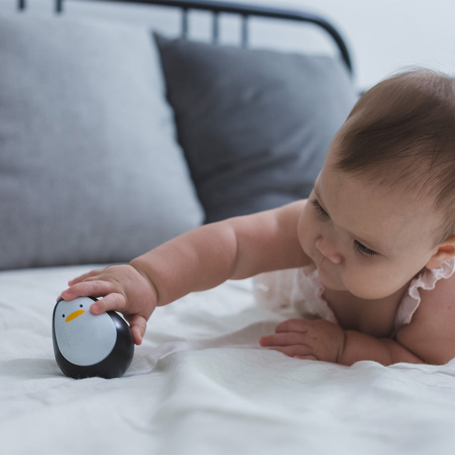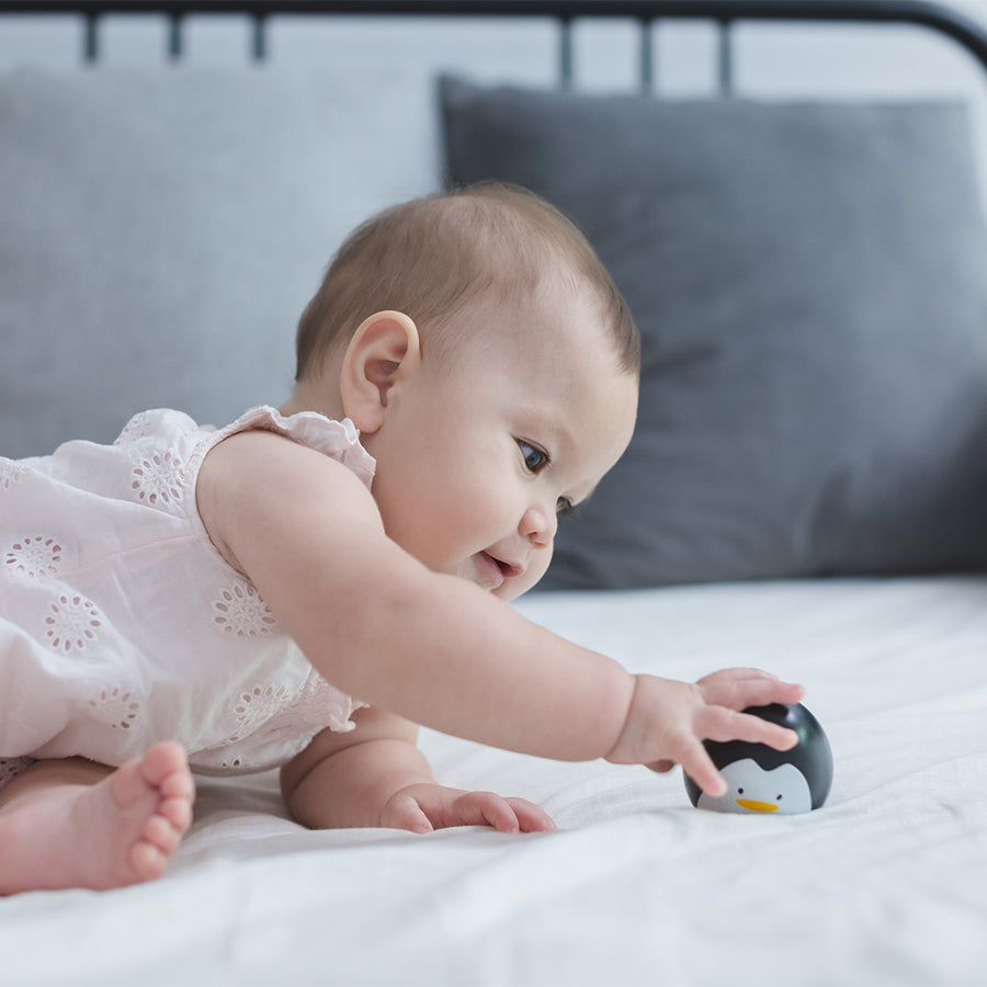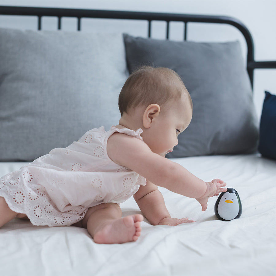Watch as baby pushes the PlanToys Penguin Wobbler in delight as it gently tumbles, wobbles, and rolls. This Penguin is weighted to help it upright itself for repeated fun. This item encourages visual development for babies and is a great toy to accompany tummy time and keeps them engaged while lying on their tummy.