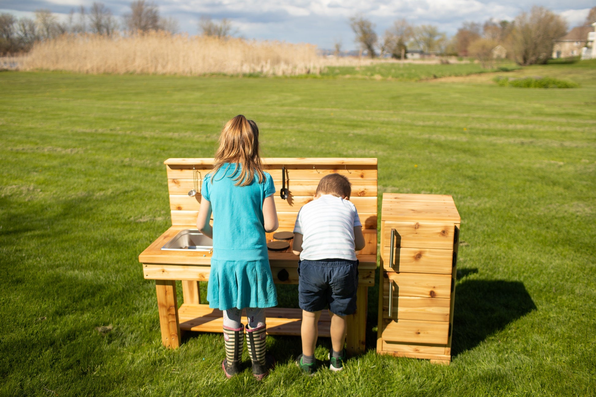 Choisissez votre robinet : sans robinet (remarque : aucun robinet d'aucune sorte n'est fourni), robinet en bois : idéal pour jouer à faire semblant, ou robinet en acier : fabriqué en acier inoxydable qui comprend le matériel pour le fixer à un tuyau d'arrosage !