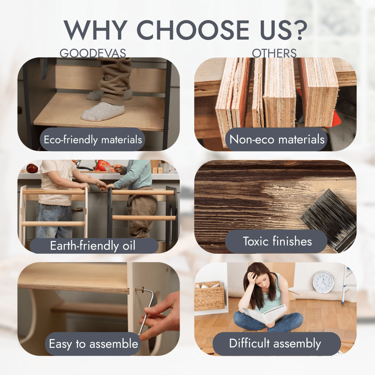 Safe and stable design: Made of durable materials, this tower provides maximum stability and protection for your child. The sturdy design prevents wobbling, and the side rails provide additional safety.