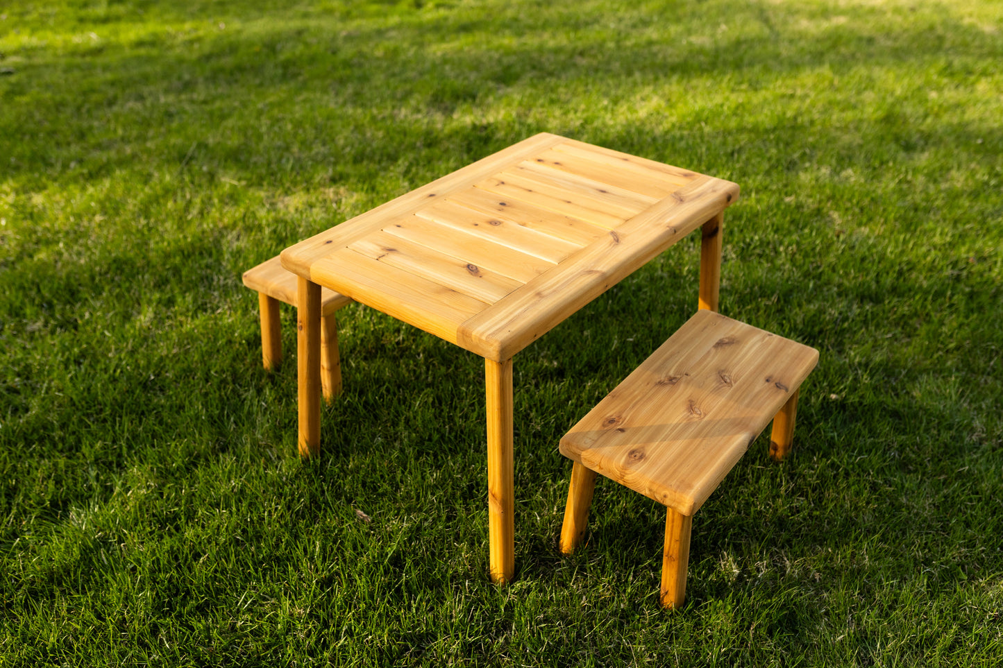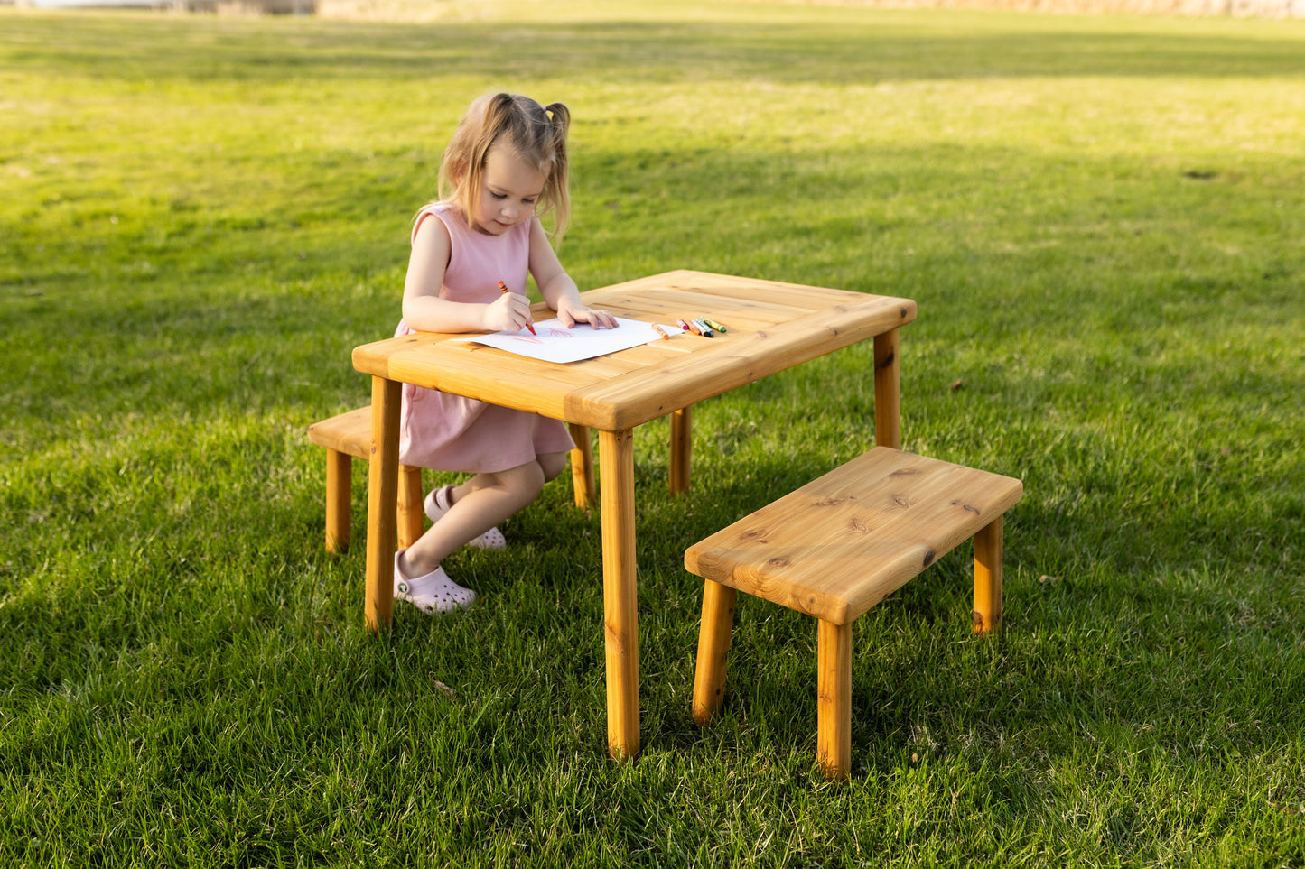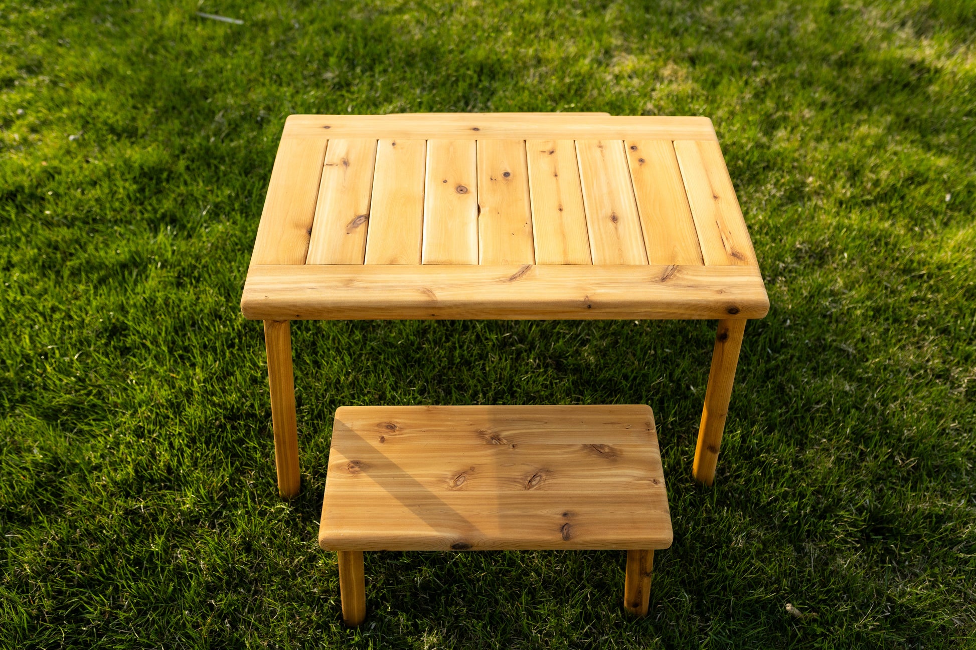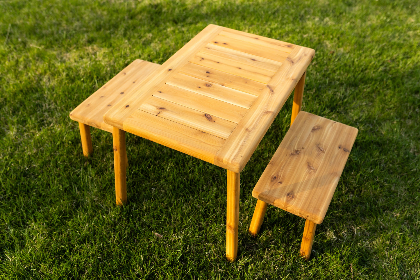 This table is wonderful for use inside or outside your home, or for preschools, schools and daycares. Each table has been carefully hand-sanded smooth for safety and comes finished with UV Protection. It is made of domestically sourced cedar that is known to last for years when left outdoors. We recommend refinishing your table every 2 years or so. The table comes partially pre-assembled with hardware required.