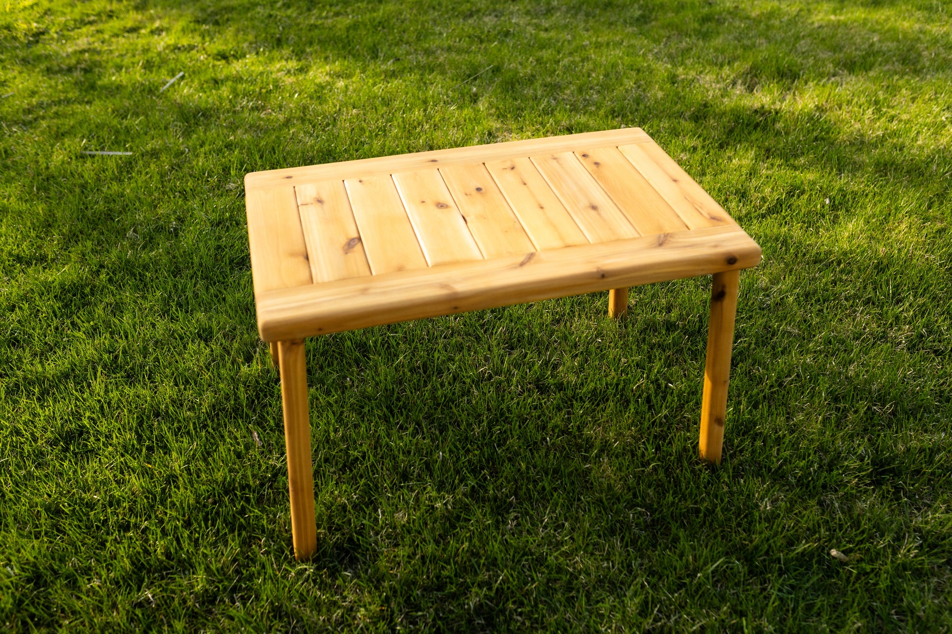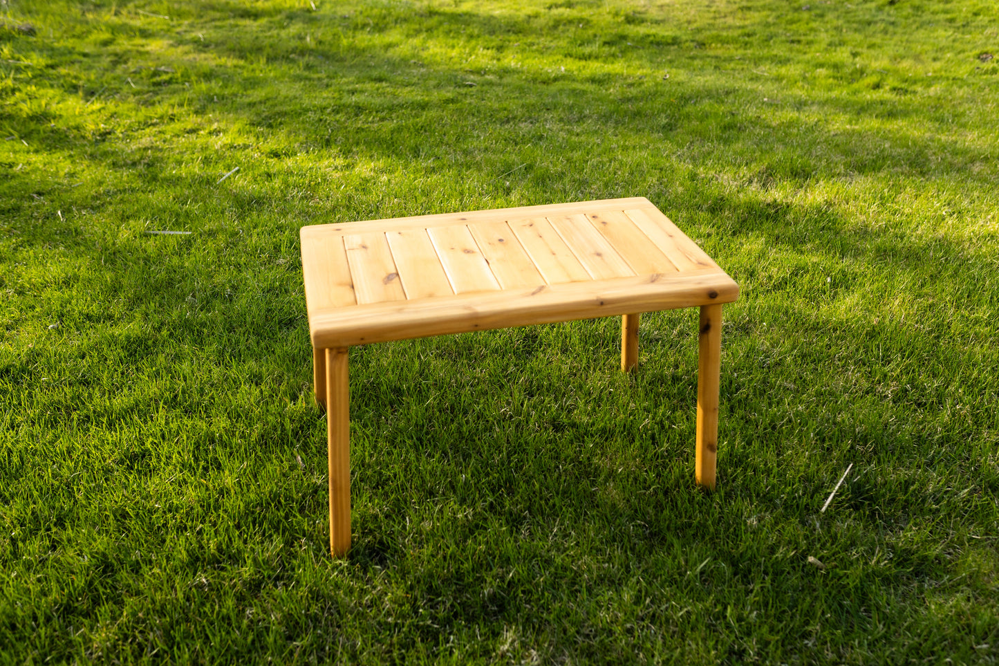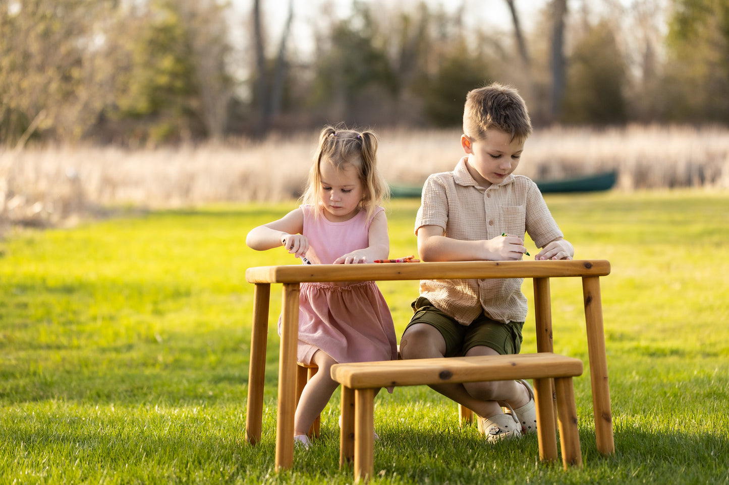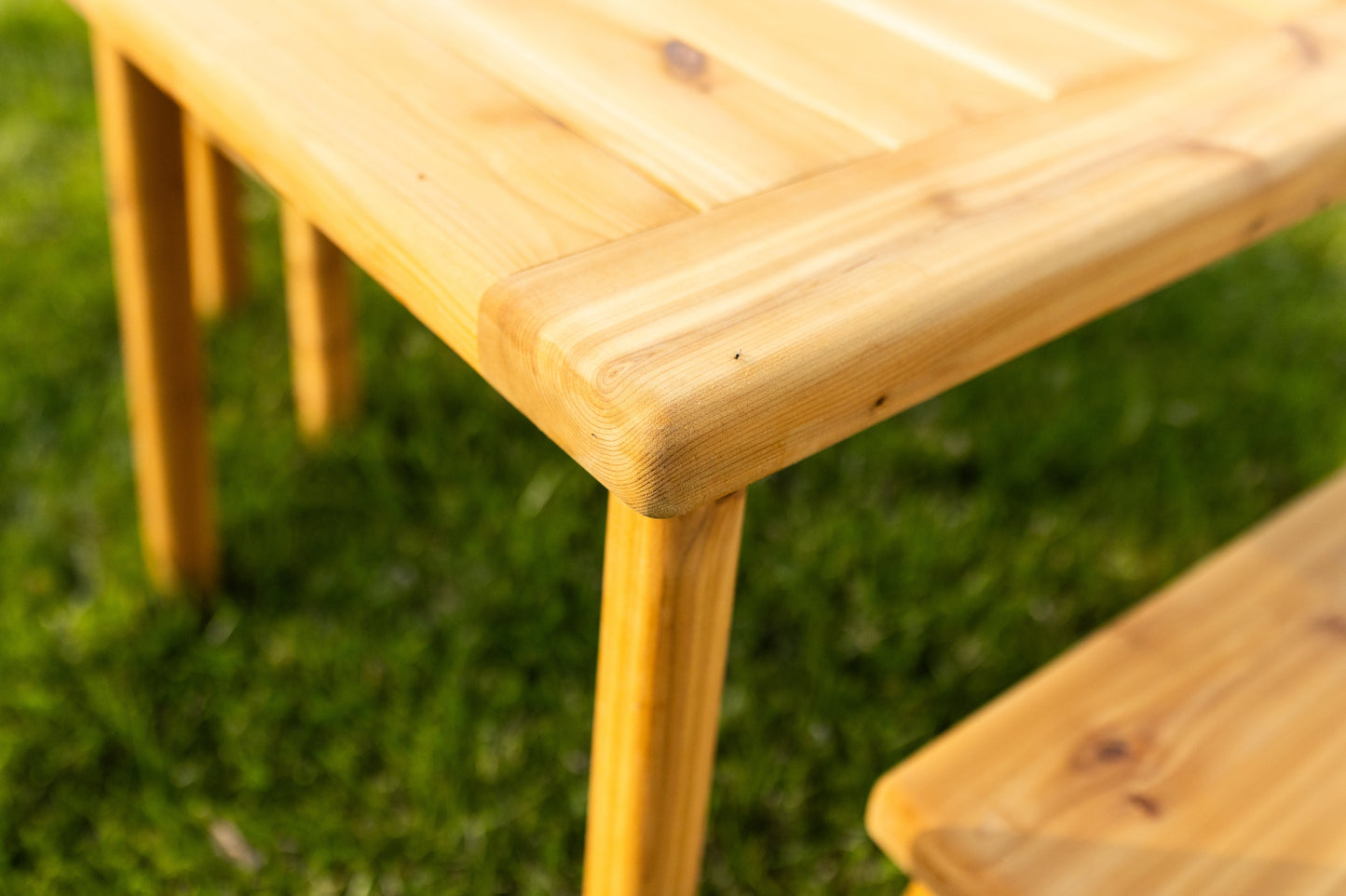 This table is wonderful for use inside or outside your home, or for preschools, schools and daycares. Each table has been carefully hand-sanded smooth for safety and comes finished with UV Protection. It is made of domestically sourced cedar that is known to last for years when left outdoors. We recommend refinishing your table every 2 years or so. The table comes partially pre-assembled with hardware required.