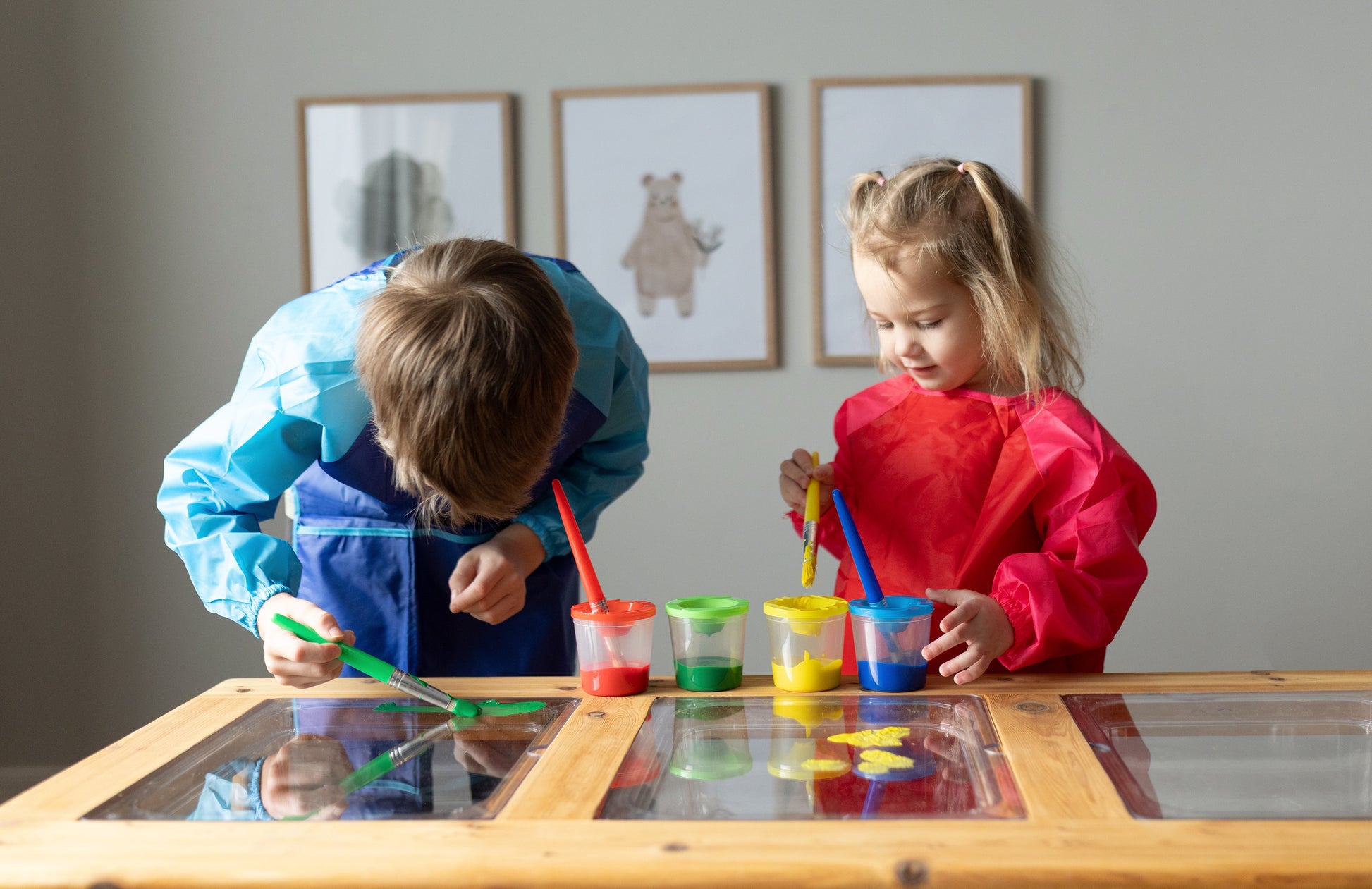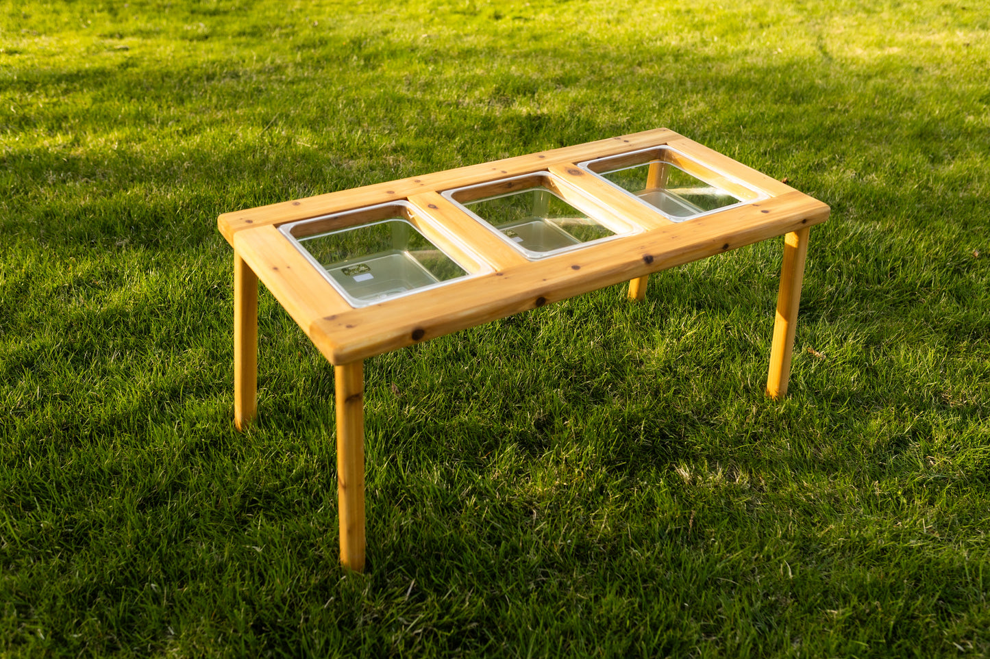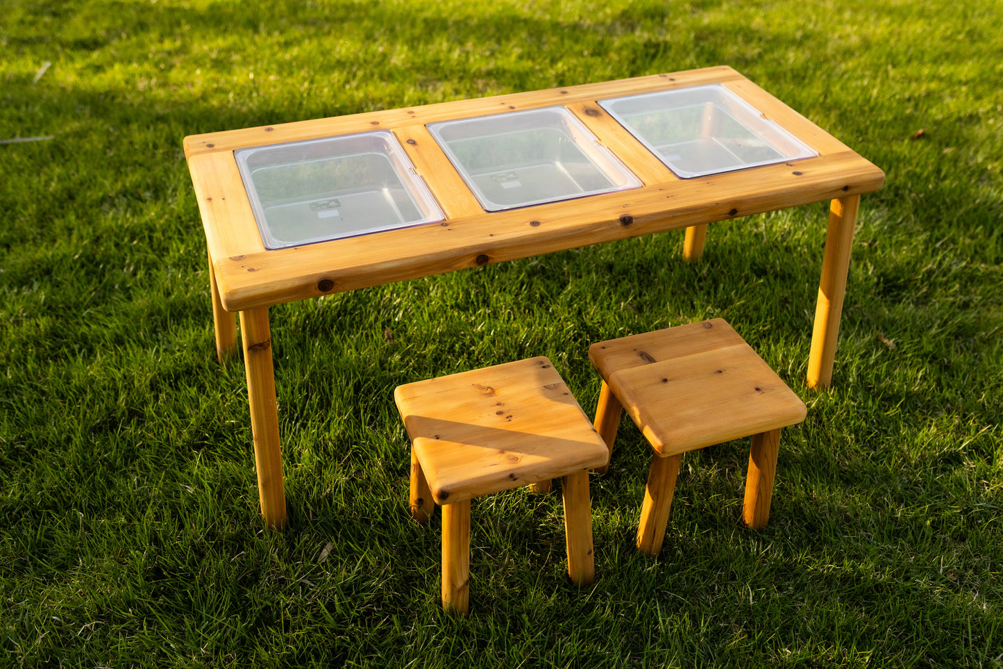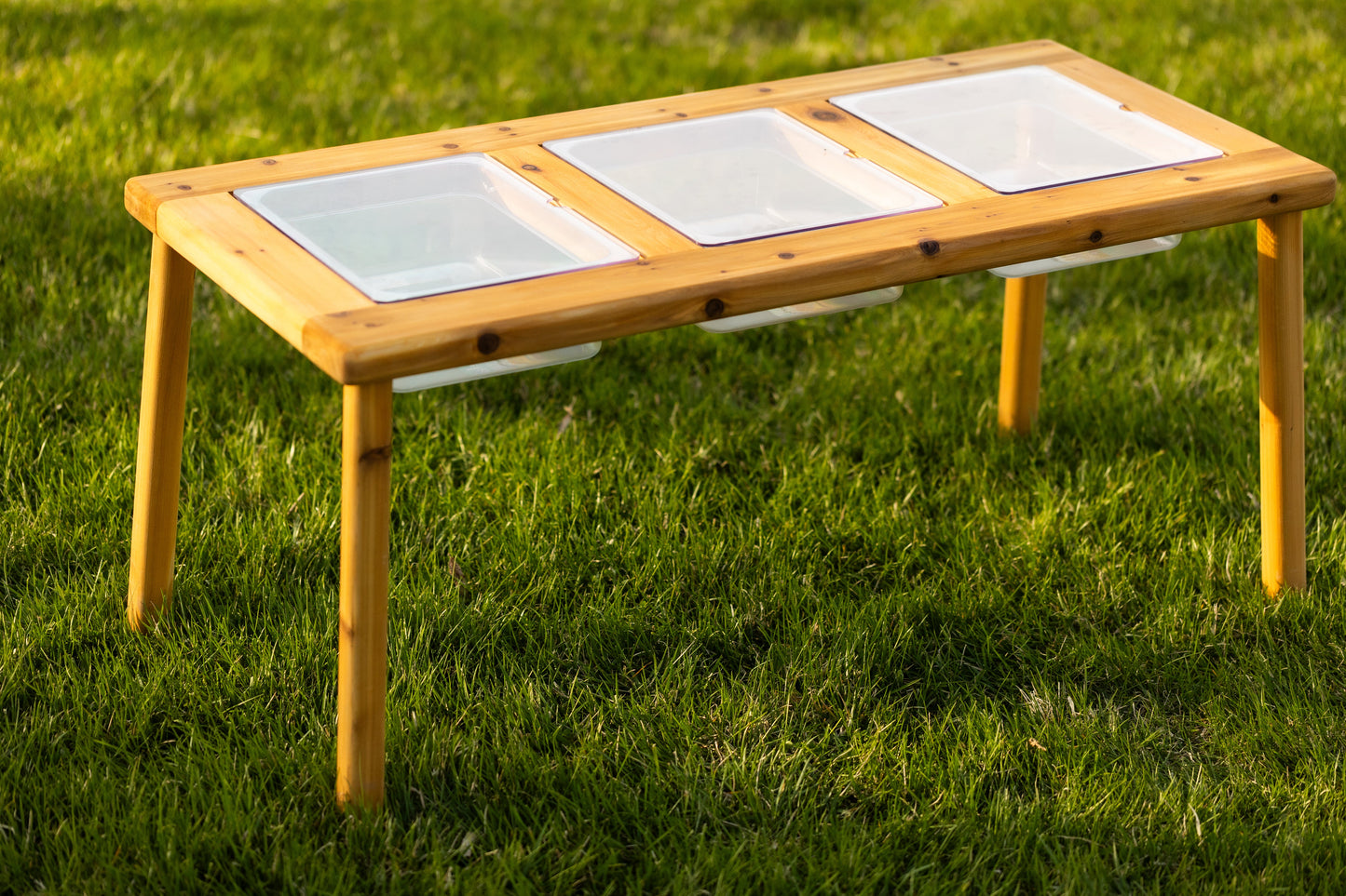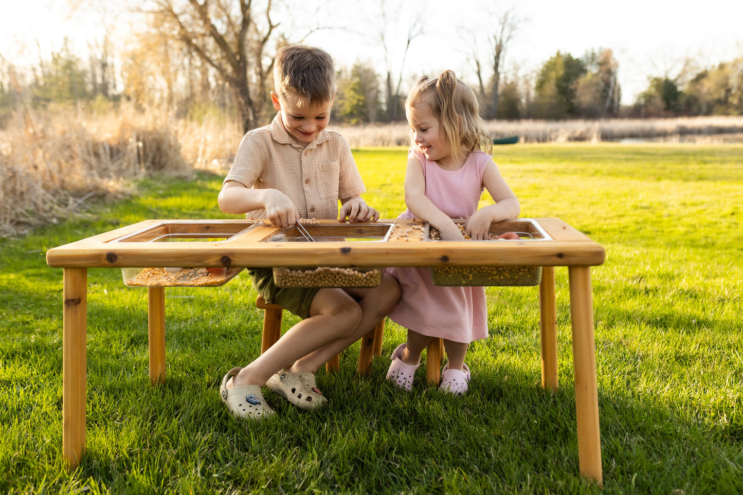 Our sensory tables are each individually handmade using 100% western red cedar. Cedar is a naturally rot-resistant and insect-resistant wood that holds up very well in all types of climate, so these are perfect for either indoors or outdoors! Outdoor sensory tables just make sense—no more mess inside your house, and children are free to get as creative and messy as they want without having to worry about clean up!