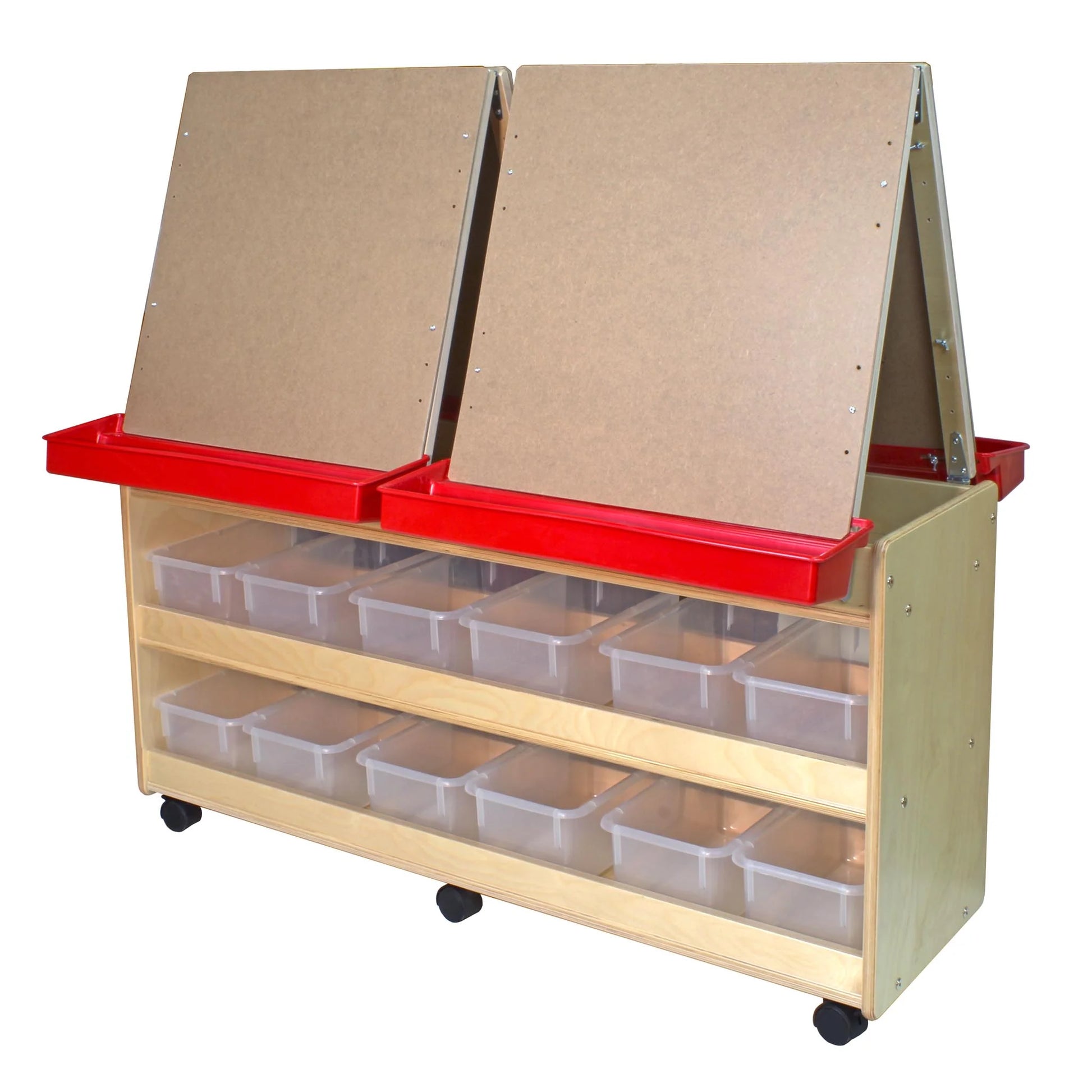 Trojan Classroom Furniture's 4 Station Easel with Storage are designed to encourage young artists, painters and builders. The Two Station Easels come with 12 bins that can hold art supplies or construction bricks. Storage bin shelves have ledges to keep bins organized and in place.