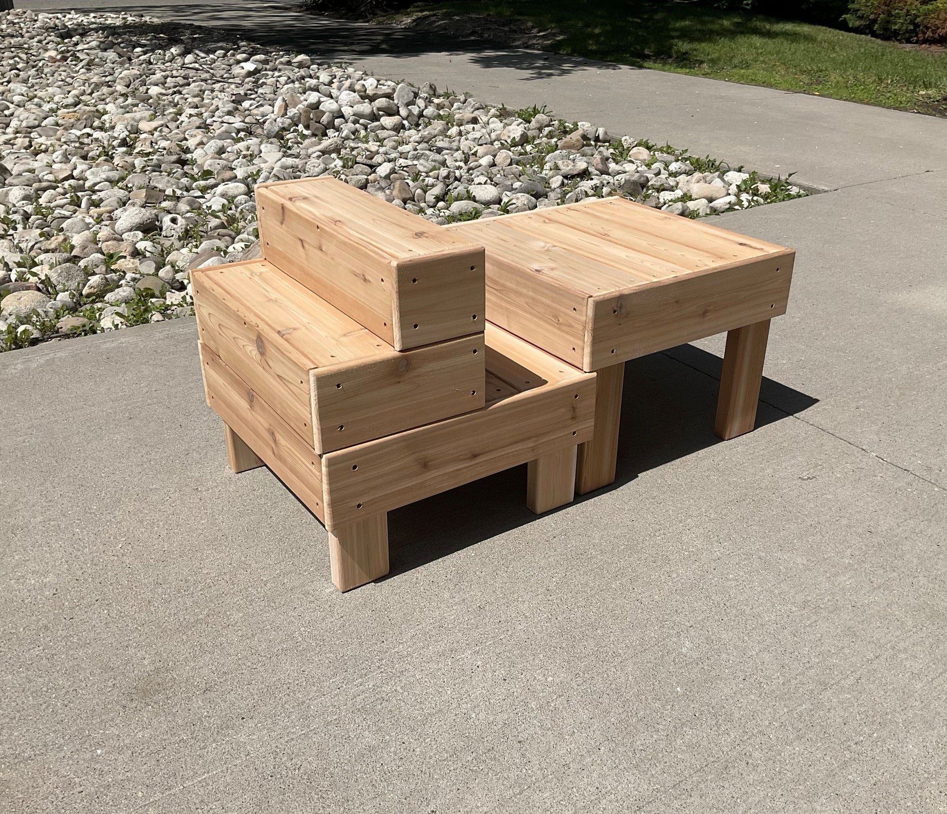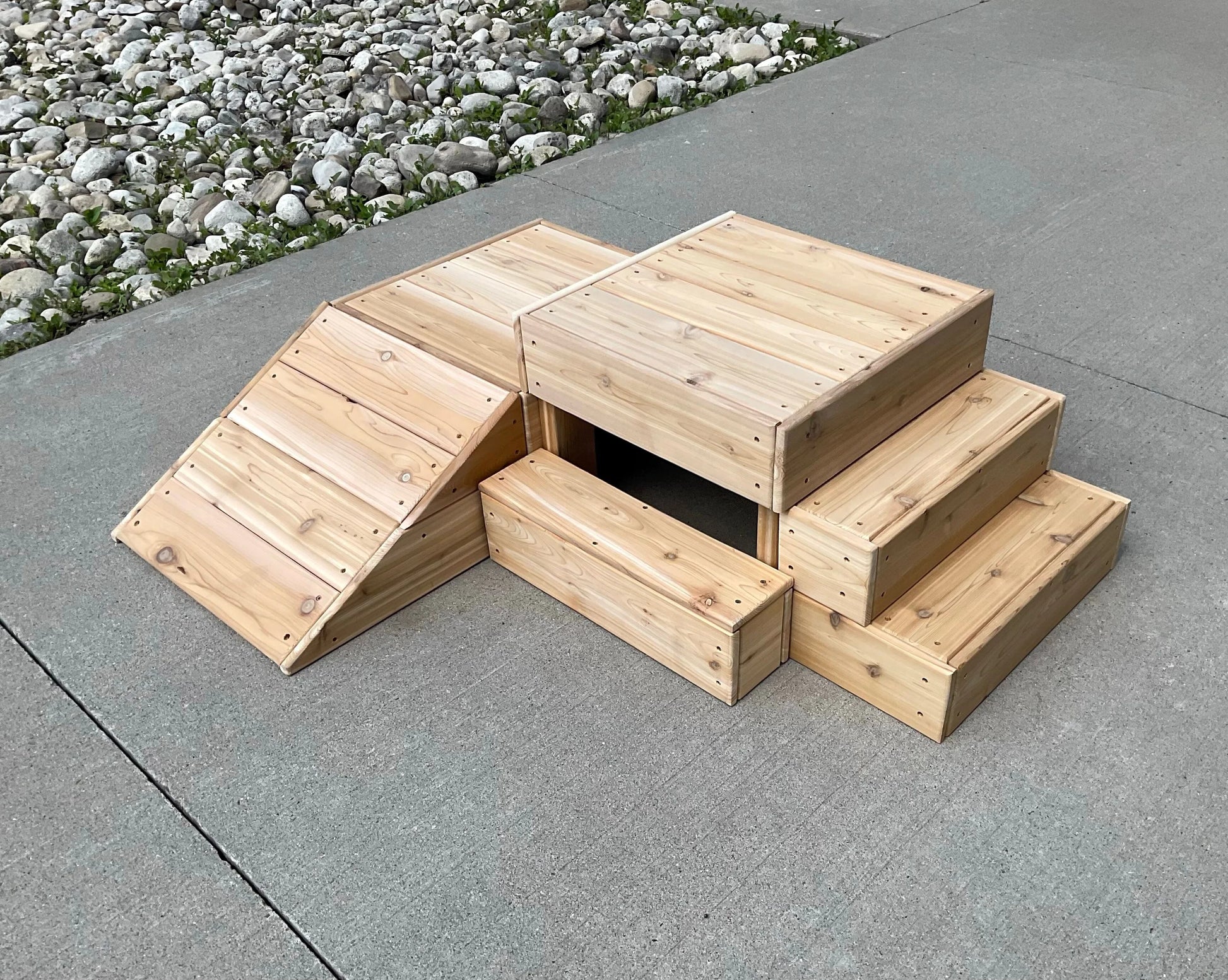 Movement And Discovery is a 6-piece set of tables, benches, steps and a ramp made with Canadian cedar. A variety of wooden resources expand outdoor learning and play where children can engage in carrying, stacking, and climbing.