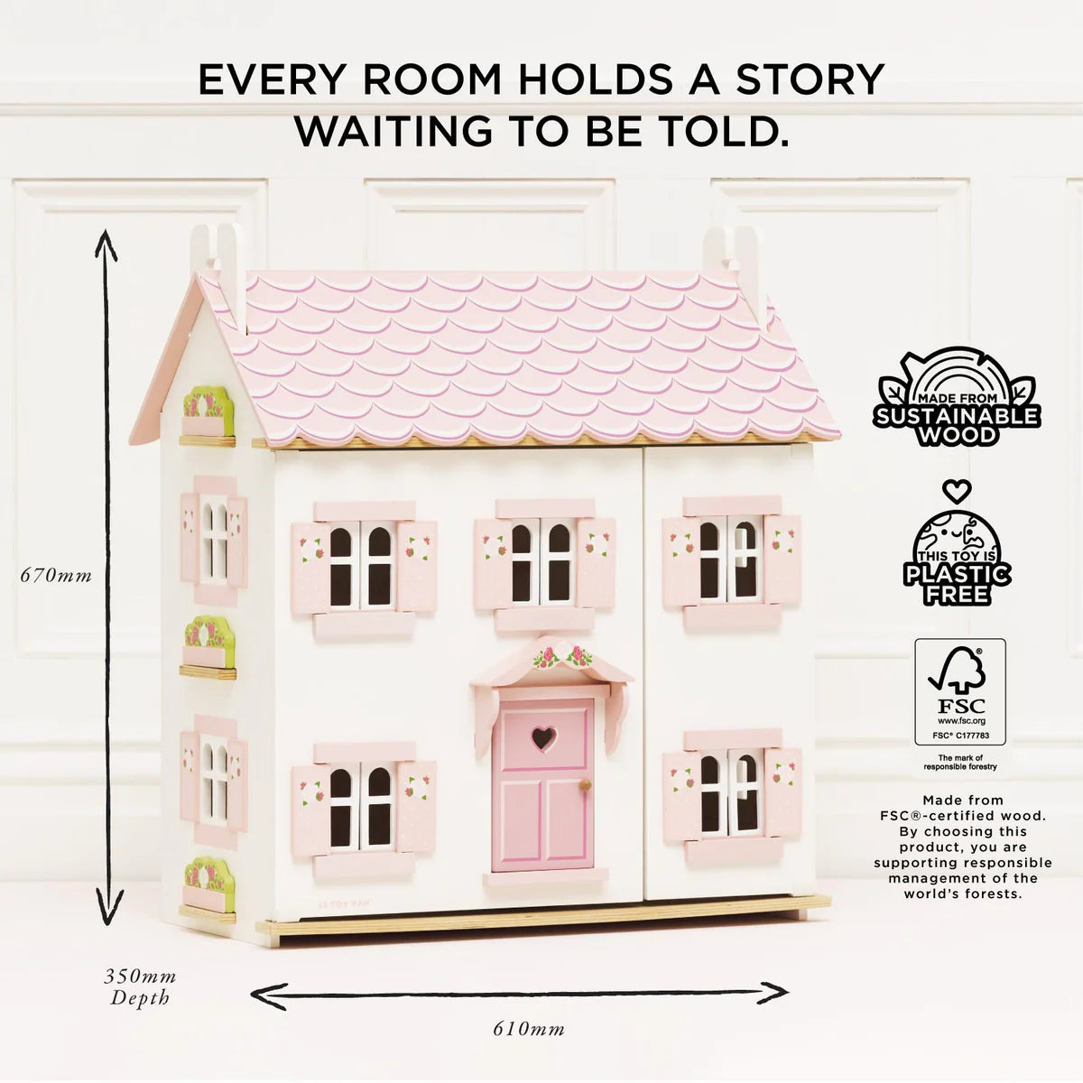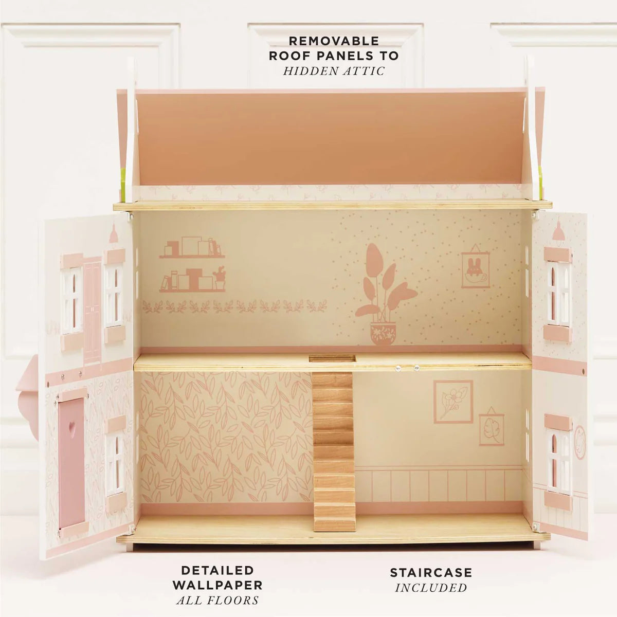 Open the front to reveal a world of immersive play. Each room is individually decorated with a wooden staircase and decorative banister. The grey tiled roof with its impressive chimney stacks lifts open to the attic space, accessed by a cute loft ladder.