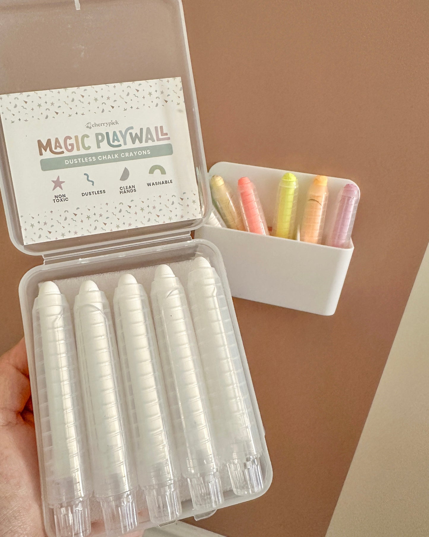 Introducing our new playful accessories, designed to complement your Magic Playwall perfectly! This bundle includes one magnetic holder and one set of dustless chalk crayons (5 pcs).