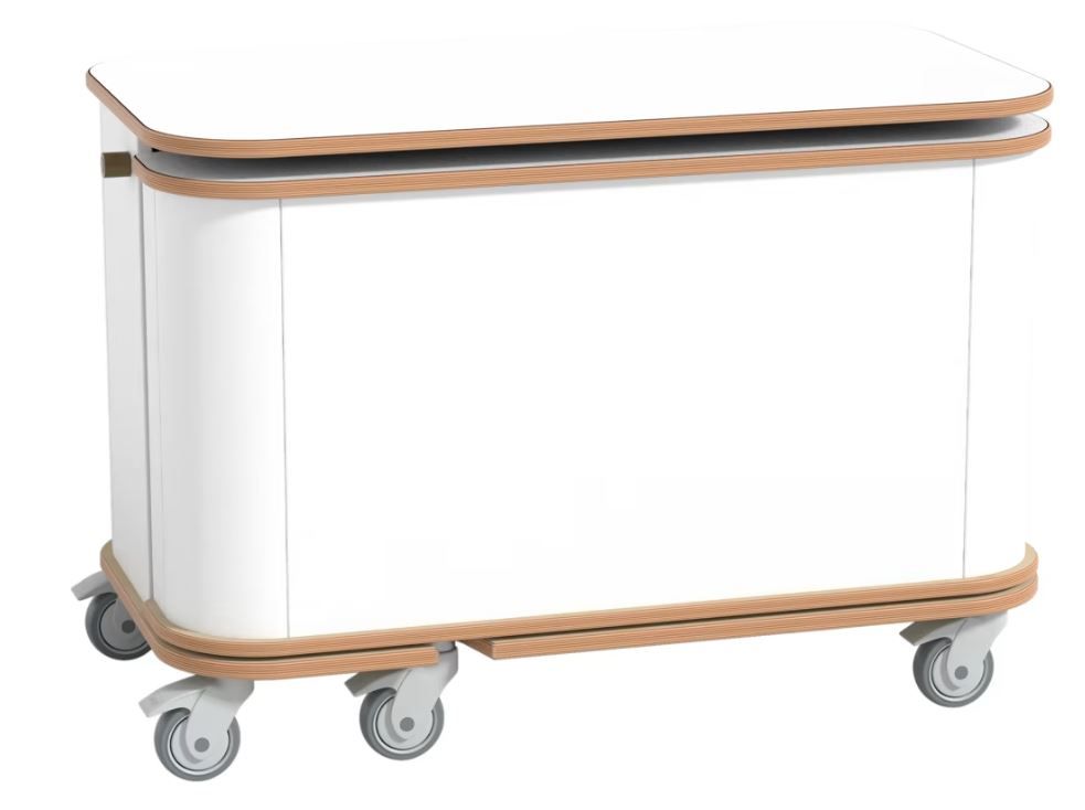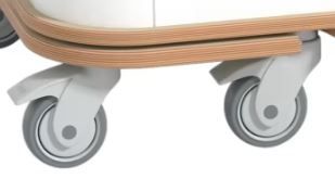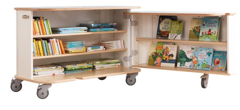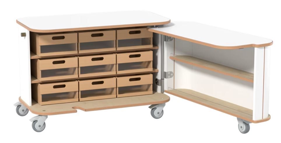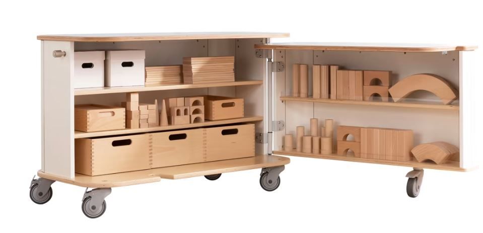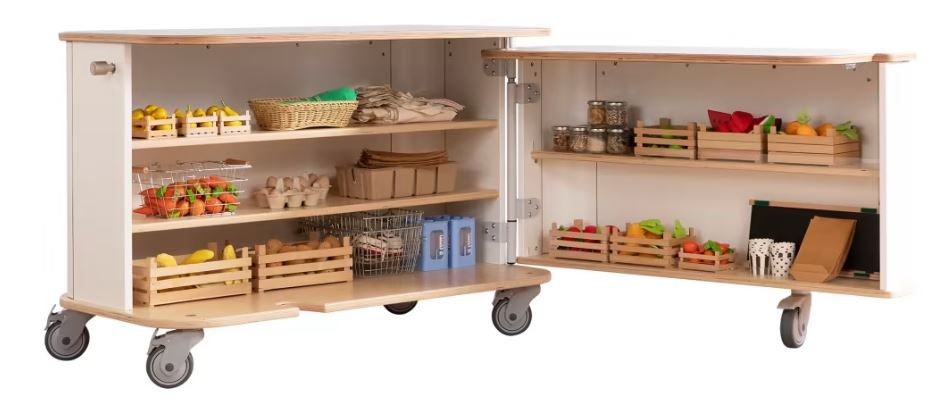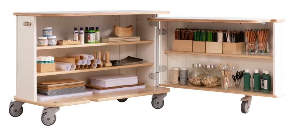 The modern trolley combines practical with playful elements. With the material trolley you are always flexible. The small miracle of storage space with a white body and a robust surface can be folded open and offers space for up to nine material boxes. Game and creative materials can be stored neatly and ready to hand, are quickly at hand and just as quickly tidied up. When closed, the trolley also offers a durable play area at a child-friendly height and when opened it even offers two. It is also practical that the material trolley can be rolled to the play or work area and used across rooms. It is closed with a rotary knob. Comes with five castors with parking brakes that make the trolley mobile or guarantee a safe stand if required. If the material trolley is not required, it can be parked in one of the garages to save space. Made of three-layer thick particle board with plywood and a strong duropal surface. Soft rounded edges for saftey.