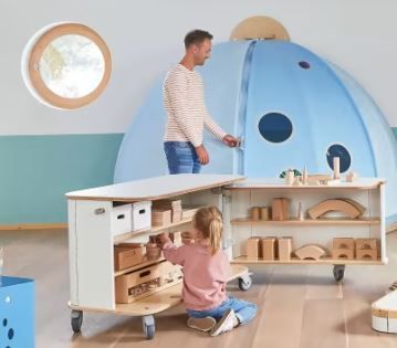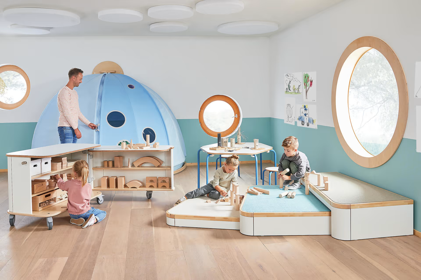 HABA Pro Breeze.upp ~ A flexible room concept to create space when needed. This furniture is ideal for educators and children from 3 to 6 years of age. It is especially useful in kindergartens, early learning centres, daycares or children's libraries. A completely new look - still compatible with our exiting furniture. The colour and shape merge smoothly into each other, resulting in a calming, low-stimulant environment. Complete group rooms with tables and stools for eating, crafting, building or retreat area.