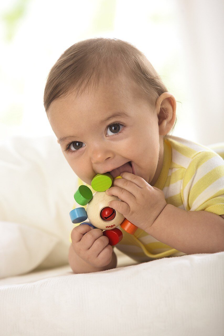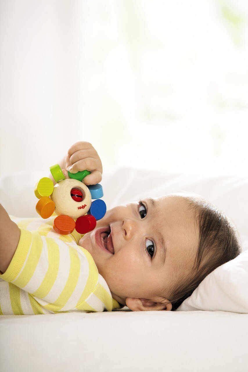 eep your child entertained with the Whirlygig Clutching Toy from HABA! The movable wooden elements and little jingling bell are secured with a strong elastic band, expertly designed to help develop clutching and grasping skills. The Whirlygig is recommended for ages 6 months and up.