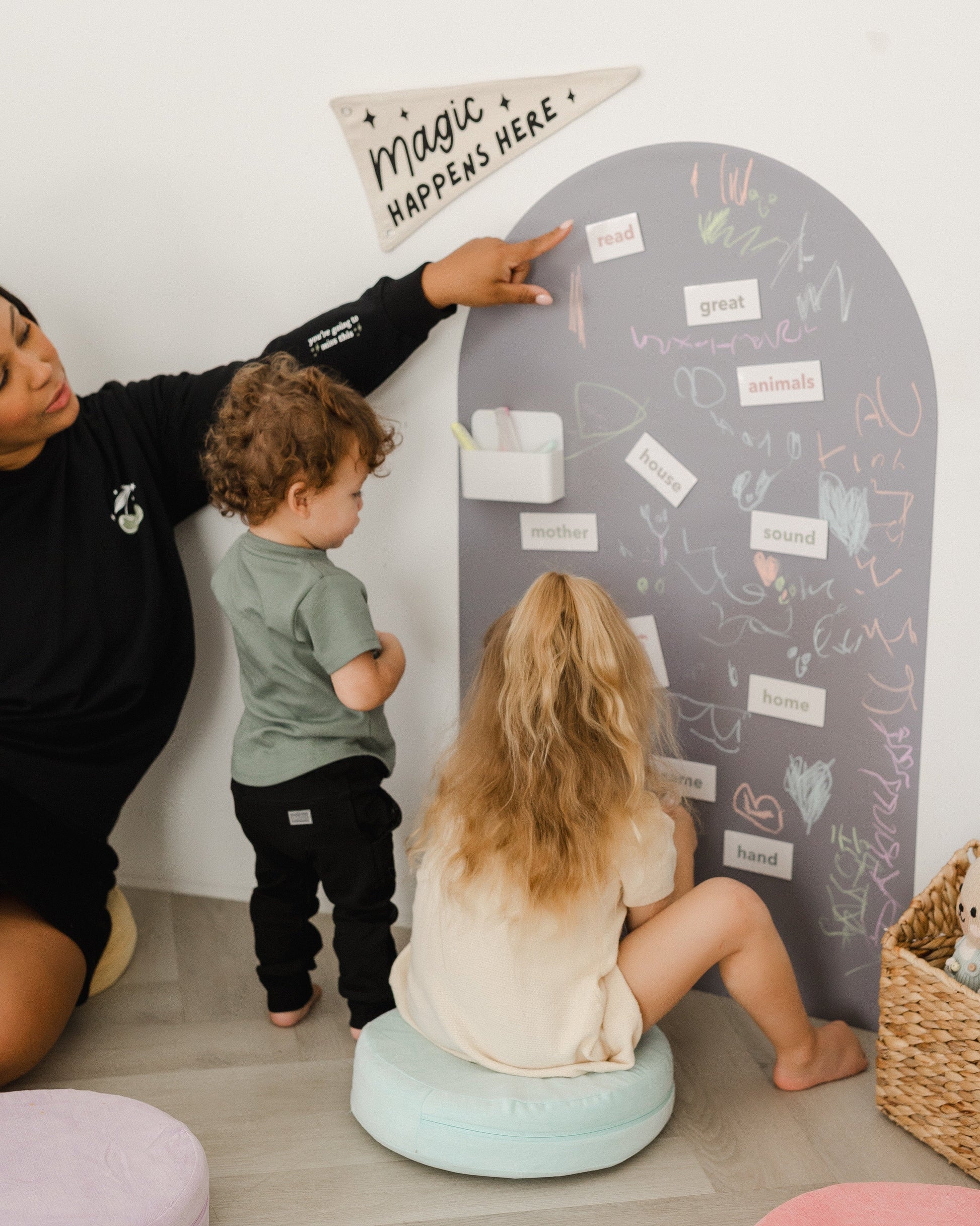 Cherrypick’s Magic Playwall is a multi-purpose, magnetic, art canvas disguised as an aesthetically beautiful wall decal. Transform your walls into the ultimate canvas of creativity for hours of open-ended, play-based fun!