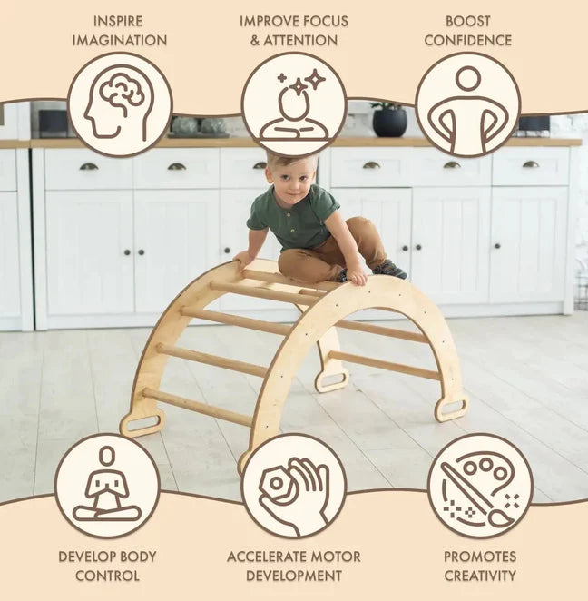 Introducing the Pikler Triangle & Slide Board & Climbing Arch Bundle - by Goodevas - an flexible and fun addition to your child's playroom that promotes physical development and imaginative play. Crafted with safety and development in mind, this versatile set includes a natural wood (beige) arch seamlessly transforms from a climbing arch into a rocker. Designed to support and strengthen your child’s limbs through the Montessori approach, this climbing frame is suitable for children aged from 1 to 6-7 years old.