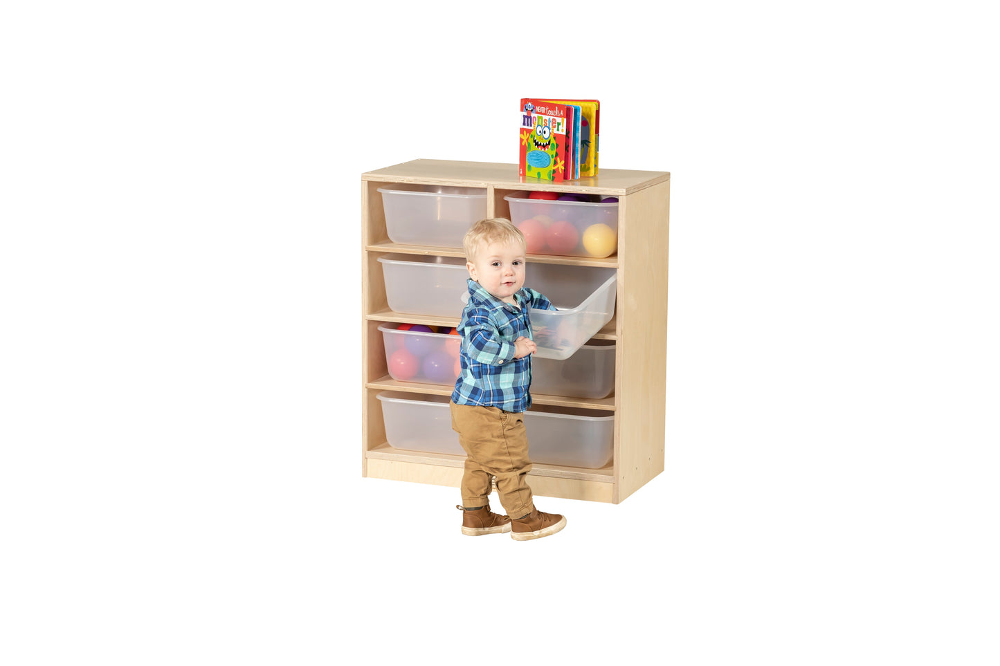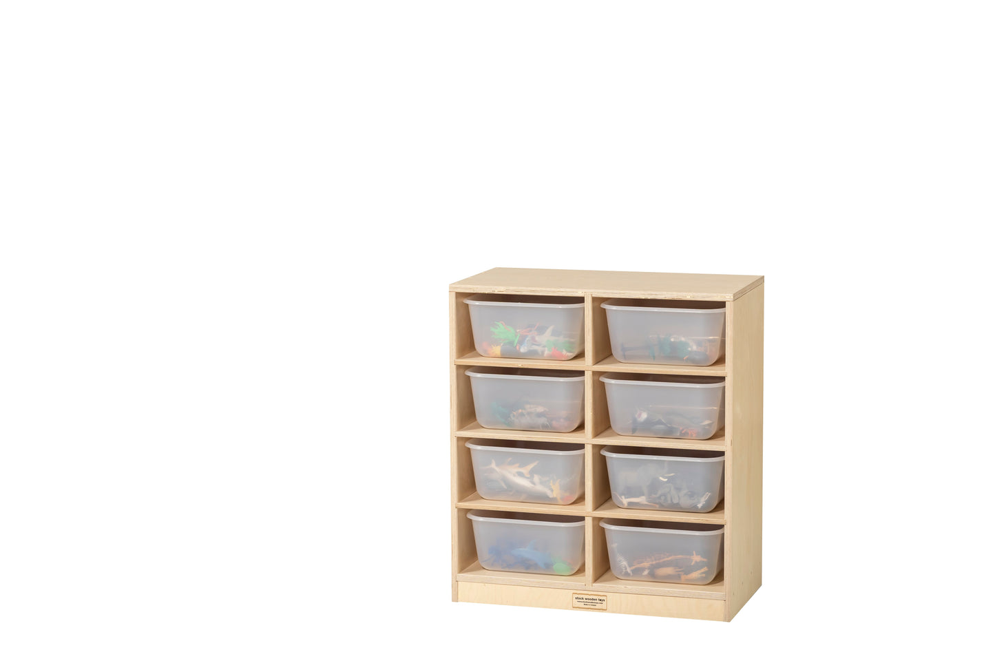 Keep your toys and learning materials accessible and visible with this set of translucent bins in a birch storage unit from Stock Wooden Toys.