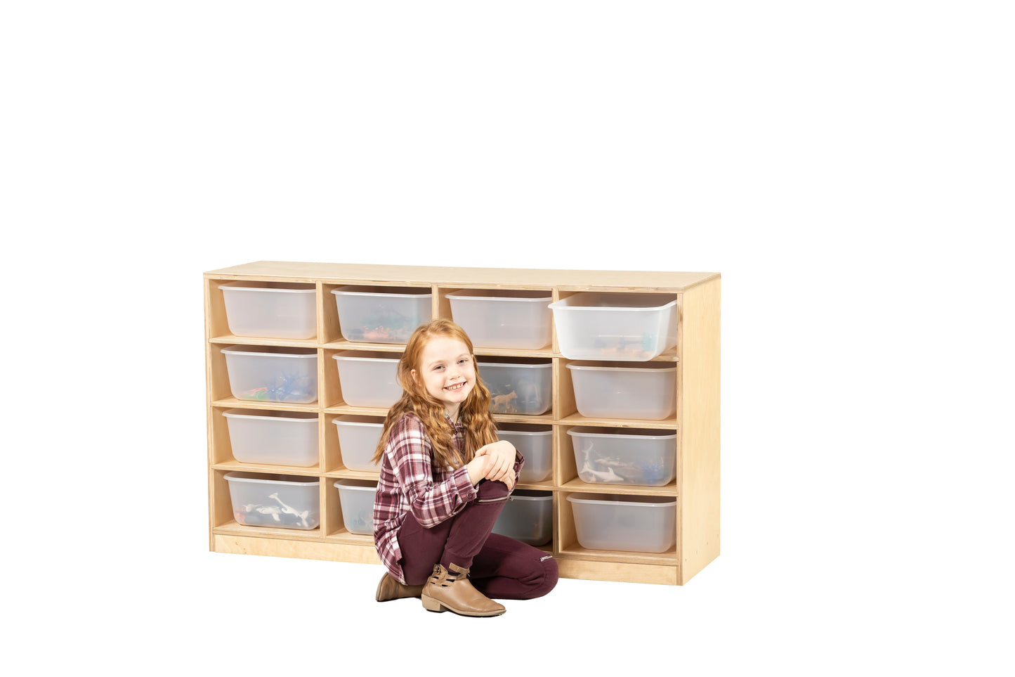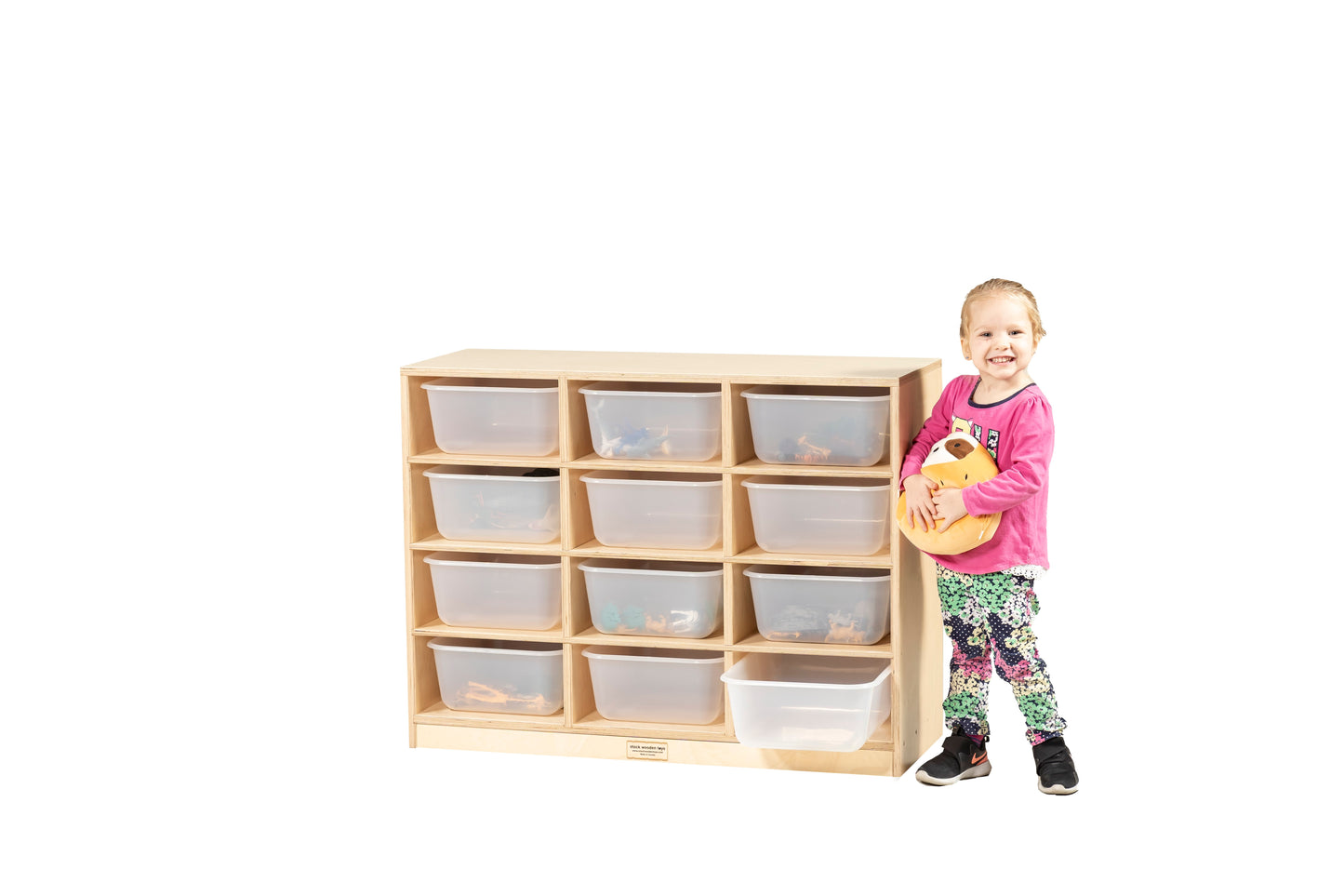 Made of 3/4″ baltic birch. This unit offers either 8, 12 or 16 compartments which have 8, 12 or 16 translucent totes for storage in the classroom. Comes with 2 locking and 2 non locking casters. A kick plate has been placed on the front of the unit to hide casters. Unit comes fully assembled. Can be used for toddler or school storage.