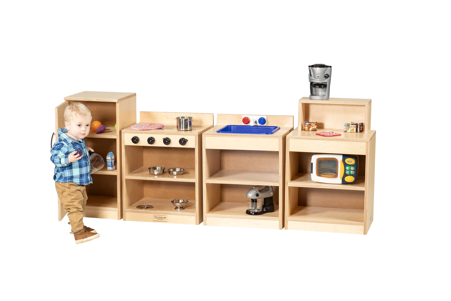 Made of 3/4″ baltic birch. Comes in 4 pieces: Fridge, stove, sink and hutch. This is great for toddler size children in the home or classroom. Sold with hot / cold water taps, stove knobs, sink pan and has silk screened burners. Accessories sold separately. Open shelves for stove, sink and hutch making it easier for toddlers to access shelves. Comes fully assembled. Ages 9 months +.