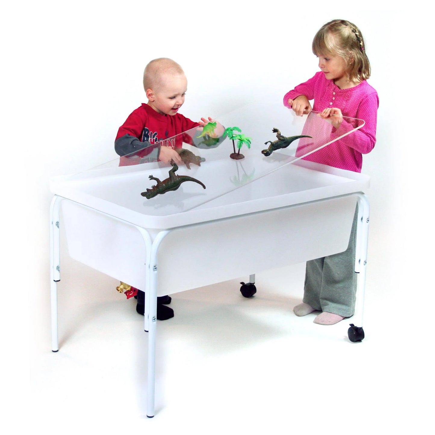 Each table includes a clear acrylic lid, providing a versatile surface to keep contents clean or for other activities. The lid serves multiple purposes, keeping the contents clean and protected when not in use and also transforming the table into a usable surface for other activities.